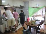 避難先は最近引っ越した長男の家です。 広いキッチンで、3人で朝食の準備です。 サトイモの葉が南側に倒れました。 |