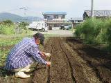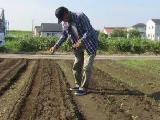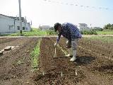 ダイコンの種まきです。畝2列に4列。 北B1の畝に、ネギの種まき3列です。 |