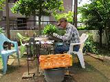 庭のテーブルでニンニクの分解作業です。 以前ニンニクが腐ったことがあります。 この方法は面倒ですが、家内のアイデア。 ネギ坊主が出たネギは処分しました。 |
