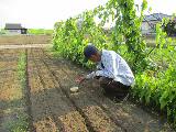 一度は失敗したニンジンの種まきに再挑戦です。 まだ間に合うと期待しながら3列の種まき。 隣ではツクネイモがしっかり育っています。 |