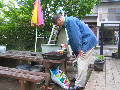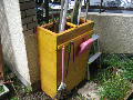 ほうき立ての組立て作業をしています。庭にはほうきだけでなく、スコップや草取りホー、松葉かきもあります。高さ90cmの何でも入る整理箱です。手持ちの木材だけで作りましたから、頑丈な製品になりました。 |