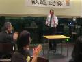 宴会の出し物になれば、私の出番だと思っています。この写真では綱渡りごまの拍手をもらっている場面ですが、後で写真を見ると必ず見ていない人がいることに気づきます。年に2回しか見れないのに、困ったものです。 |