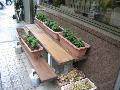 教育センターに設置したプランター台です。板は自宅で防腐剤を塗り、センターに持ち込みました。板を乗せた鉄製の台は、以前使用されていた物のようです。幅60cmのプランターは、9個乗せることができます。 |