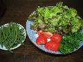 野菜サラダといっても、生で食べるだけです。実はサニーレタスを手でちぎっていたいたとき、ぼんやりしてインゲンをゆがきすぎました。いつまでもゆがいたため、色が変わりました。 |