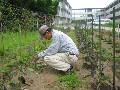 ナスの除草も一応終わりましたので、支柱に紐かけをしています。このとき、株の下から発生している脇芽を取り除きました。キクと同じように、三本仕立てにしました。この頃からナスを収穫しています。 |