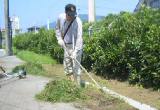 城山小学校の草刈りを、1時間半がんばりました。どこの学校も防球ネットの下は、いつも草が生えています。これは風で運ばれた草の種がネット下に落ちることと、足で踏まないからと考えています。草刈り機の刃がネットを切りますから、ネットを持ち上げて処理します。 |