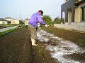 | タマネギを植える予定の場所で、石灰・牛フン・配合肥料の三点セットをまきました。石灰はもっと早くまいておくべきでした。 | ![]() |