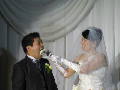 ケーキカットのあとの、新婦が新郎にケーキを食べさせるシーンです。羨ましい限りです。私にもこんな時期があったのに、遠い遠い昔の話になりました。夫婦円満の秘訣は、私が耐えることでした。 |