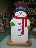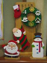 左のスノーマンは、新聞折込の絵を利用しました。この作品も欲しいという人が現れました。現在センター・図書室の入口は、12月の雰囲気を表現しています。三角コーナーの上と下を二人で分担しています。私は台の上を担当していますから、トールペイントの作品を飾ります。 | ![]() |