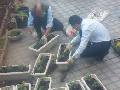 花の移植作業をしているのは、教育センターの先生です。花壇の土をプランターに入れ、パンジーの定植をしています。私はこの姿に感動し、非常階段から撮影したのです。この作業風景は春と冬の二回のみですから、滅多に見ることはできません。 |