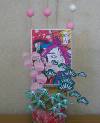 花餅飾りを作るのに、手芸店やホームセンターをめぐりました。材料は手芸店で買った発泡スチロールの球20個と、ホームセンターで買った竹ひごです。球は白色ですから、半分ピンクに塗りました。松竹梅はそれぞれ印刷したものを切り取り、手芸用のワイヤーに貼りました。凧も含めすべての小道具は、わら台に刺しました。 |