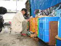| ダイコンが2ケース、ミズナが4ケースです。さらに花屋で貰った苗が2ケースです。野菜は洗ってからトラックに積みました。葉物(ミズナ)は一度水に浸しておけば、しおれることはありません。なんと優しい福井さんでしょう。 | ![]() |