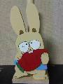 最近頑張っているトールペイントですが、今回はニンジンを食べているウサギです。この作品はユーモラスなので、すでに5個ほど作っています。この形を元に、犬が骨を食べる図案を作りたいものです。 |