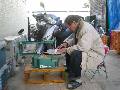 駐車場での板切り風景です。夏でしたら7時頃からしますが、寒いので8時からの作業になります。動物1個切るのに、約15分かかります。こんな作業場が欲しいのですが、なかなか宝くじが当たりません。 |