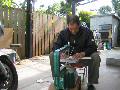 糸のこで切断するのが好きで、駐車場で作業をします。ボールペンで引いた線の上を、細いのこ刃で切っていきます。集中力がいりますので、傍にいるチェリーも静かにしています。周囲は木切れが散乱していますが、週に1階しか掃除しません。 |
