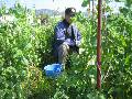 思い切ってエンドウの収穫をしました。青いバケツに二杯ほど取れました。例年と大きく違うことがあります。例年より二週間ほど早いことです。そして、生長が遅くエンドウの丈が低く、なぜか数株枯れました。今年は不作です。 |