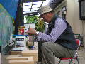 | 電動糸のこでアガチス材を切るのは、大変楽しいものです。しかし、そのあとベルトサンダーで磨く必要があります。磨いた木屑が周囲に飛びますので、かなり吸い込んでいるようです。サンダーで磨くと仕上がりが美しく、手作業と比べ時間短縮にもなります。 | ![]() |