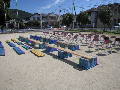 前日に持ち込んだ椅子等を並べました。昨年パイプいす30脚だけだったので、 踏み板やコンテナと厚板での椅子を追加しました。座る場所を増やしました。 |