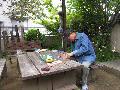 5時起床。コーヒーを入れ、ペイントのブタ(大)二つを塗り始める。7時頃に着替えて、チェリーと散歩に行く。8時からアガチス材に線引きをして、駐車場で板を切る。途中朝食を食べ、10時まで作業を続けた。狂犬病予防接種の日なので、チェリーを城山コミセンまで引率する。費用は三千円なり。帰宅して再び板を切る。12時には中断して、福井農園に顔を出す。サラタマとスナックエンドウの収穫をする。1時に帰り、車で外出する。熊本駅でドーナツ棒を買って、そのままフードパルに急ぐ。「とれたて市」の店長さんに会い、トールペイントの委託販売の打ち合わせをする。バーコードの入力方法と展示場所を教えてもらう。最初の納品は5月1日と決定する。理由は一つ、私の誕生日だからである。帰ったついでにスタンドに行き、久しぶりの洗車である。3時半から少しだけ板を磨き、近見町のウッドファームに出かける。処分する予定の建築資材をもらうためである。Sさんと倉庫を探したが、すでに処分されていた。落ち込んで帰宅する。6時夕食。工作をしたあと、下代公民館へ行く。8時から今年最初の隣保組長会に出席。8時半に帰り、しばらくブタ(大)二つを塗る。