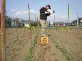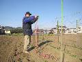 エンドウの支柱30本をハンマーで固定しました。 パイプが長いので、コンテナに乗って作業しました。 |