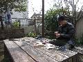 暖かいので、庭の作業台で板を磨きます。 駐車場ですると、チェリーが邪魔をします。 |