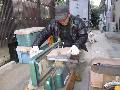 駐車場で板を切ります。 ついに軍手をはめました。 |