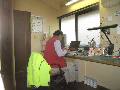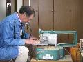 糸のこでアガチス材を切ります。床にのこくずが大量に溜まります。