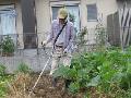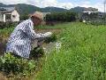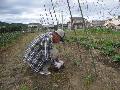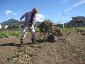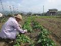 サトイモの草刈りをしています。 右の葉はカボチャです。 |