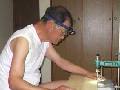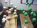 木球に穴をあけてヒノキ棒を接着します。次に着色します。 乾燥したら5ミリ位で切断します。それをラミン棒に接着します。 |