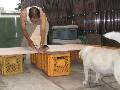 コンパネを切り、夏祭りの看板作りです。 愛犬はノコくず食べて手伝っています。 |