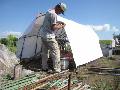 畑のテントに特注のシート張りです。 今度は頑丈です。一生物です。 |