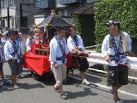 10時50分には公民館で法被に着替えた子どもたちが、神社に集まってきた。総勢85人の小学生と大人が15人ほどである。全員帽子と水筒持参である。11時爆竹を合図に、子どもみこしの出発である。町内をワッショイワッショイ言いながら、みこしを全員で引く。あつか〜、あつか〜。お賽銭も少なめだ。11時半過ぎに「エース」の駐車場で休憩する。毎年この店でジュースをサービスしてもらう。公民館に向けて再び出発。ここで小学生は公民館で着替え、みこしは菅原神社で収納する。きつかった〜。