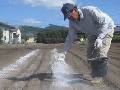土をアルカリ性にするために、石灰をまきました。 マメ類は10月下旬に種まきします。おいしいぞー。 |