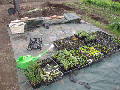 畑にトラックのシートを広げました。 キク・ノースポールの苗が育っています。 |