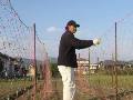 エンドウに支柱を立てて、ノリ用のネットを下げます。 風で動きますから、ひもで固定しなければなりません。 |