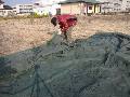 畳15枚分ほどの広さを、カッターナイフで切り分けました。 肥料の上にかけたり、テントの下に置いたりと便利です。 |