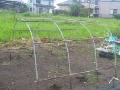 パイプに寒冷紗を乗せて、簡易ハウスの完成です。