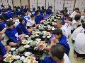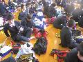 旅館「洛兆」での夕食風景です。 力合中の生徒はよく食べます。 |