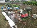 台風が直撃します。東のテント周辺の台風対策です。 毎年のことですから、要領よくできるようになりました。 広い物は結び、軽い物はロープと杭を利用します。 |