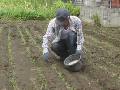 北B2のニンジンが少し生長しました。 腰を落として、化成肥料をまきました。 もう少し伸びたら、間引きします。 |