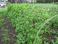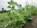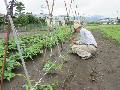 ツクネイモのツルが伸びてきました。ひもで誘引。 |