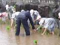 城山小5年生は150人くらいいます。 近くの学校田で、昔ながらの田植えです。 |