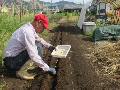 東2に3列の畝を作りました。昨日からダイコンの種まきです。