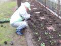 Tu区長さんと一緒に、花壇に花を定植しました。 小雨降る中での作業になり、私の服は濡れました。 |