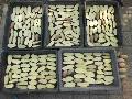 2月も近い。種ジャガを縦割りしています。 切り口を乾燥させれば、灰を塗る必要はありません。 10キロのジャガは、育苗箱に5ケースです。 |