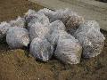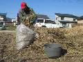 これまで掘り上げたサトイモの親を使いました。 刈り草の袋は、透明袋にたくさん詰めました。 |