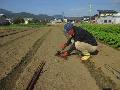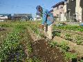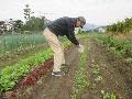西1の畑で、葉物野菜に肥料をまいています。 気温が下がったので、生長はゆっくりです。 |