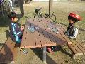 区長さんが2人応援に来て、剪定作業をしました。 フジ棚の下で、小学生がカードゲームをしていました。 |