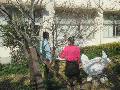公園のカシワ剪定作業を3人でしました。 大きな枝は2人でノコをひきます。 剪定枝をロープで結ぶのも大変な作業です。 |