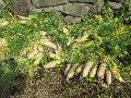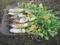 収穫が遅れたダイコンに、花が咲きました。 引き抜いて北Eに捨てています。200本ほど。 |